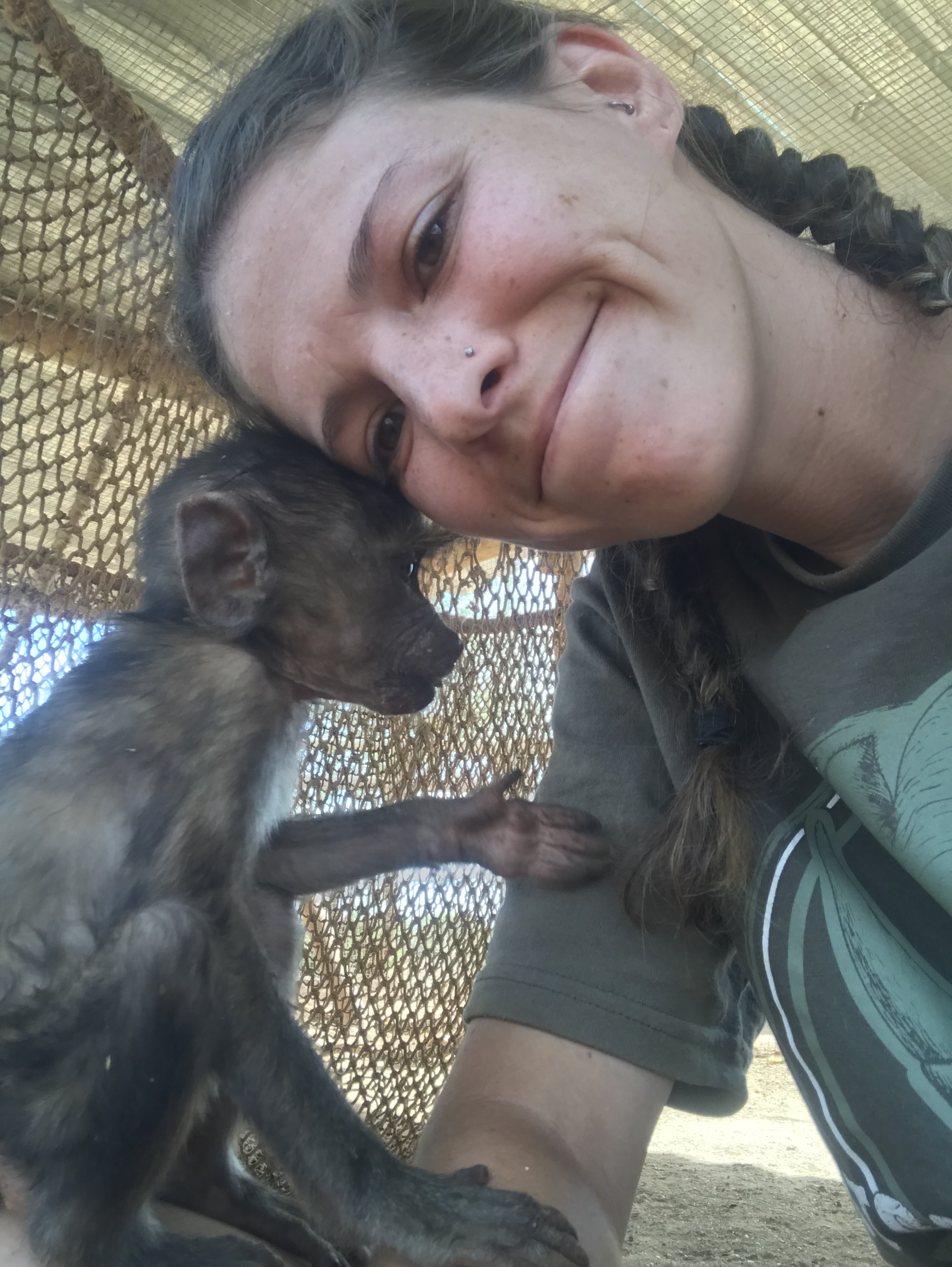 In the afternoon, we were assigned to baboon walk. We were supposed to take out the same group I had been with on Saturday. However, someone had to stay behind to keep two of the very young ones company while all the others were gone. I volunteered since I had already been on a baboon walk and the other people in my group had not. I was responsible for watching Ruby and Philly. Philly is very used to people as he has been hand raised since he was very young. Ruby just recently came in so she is not used to people yet. They were very sweet though and very interested in me for the whole time.