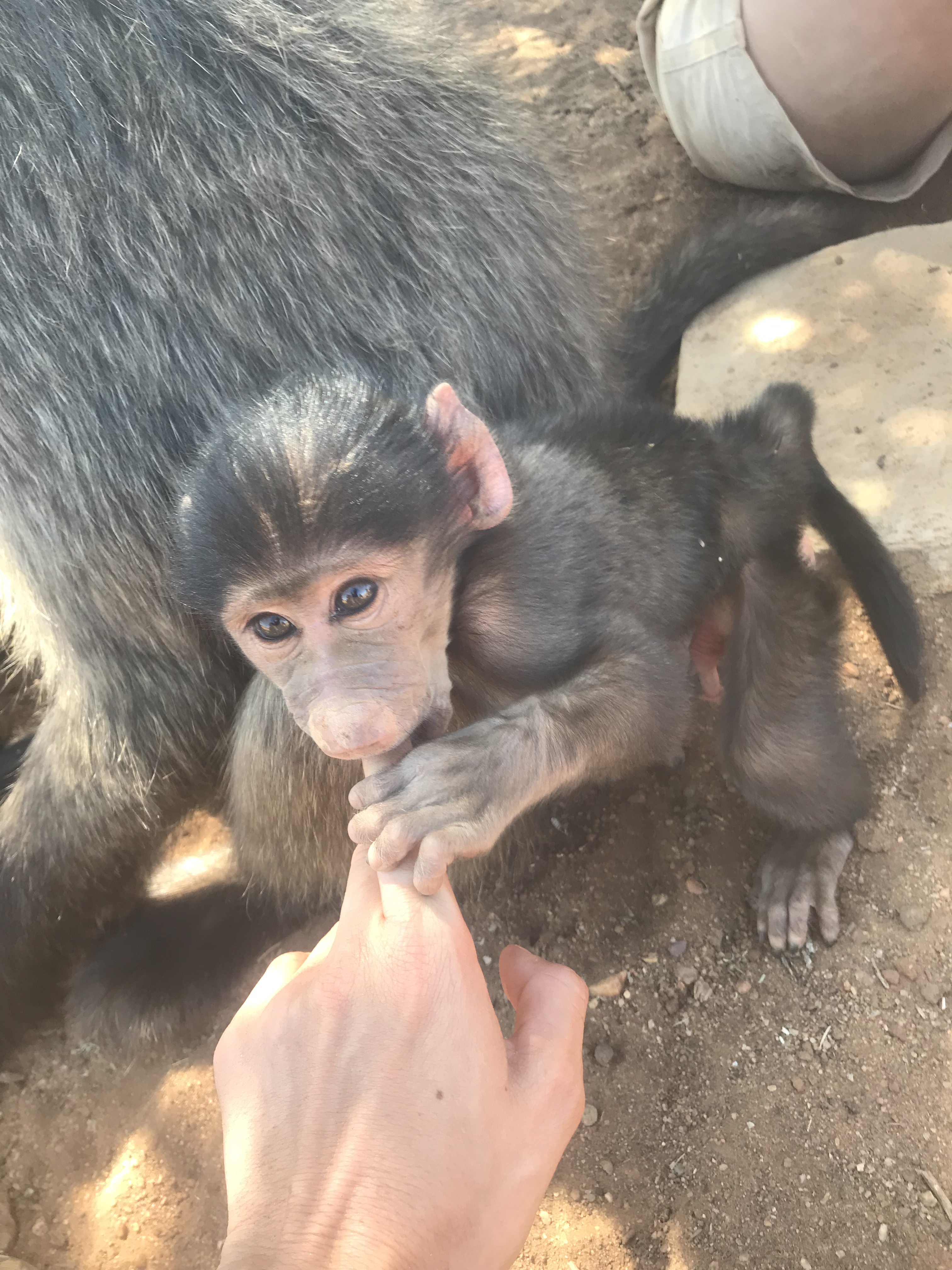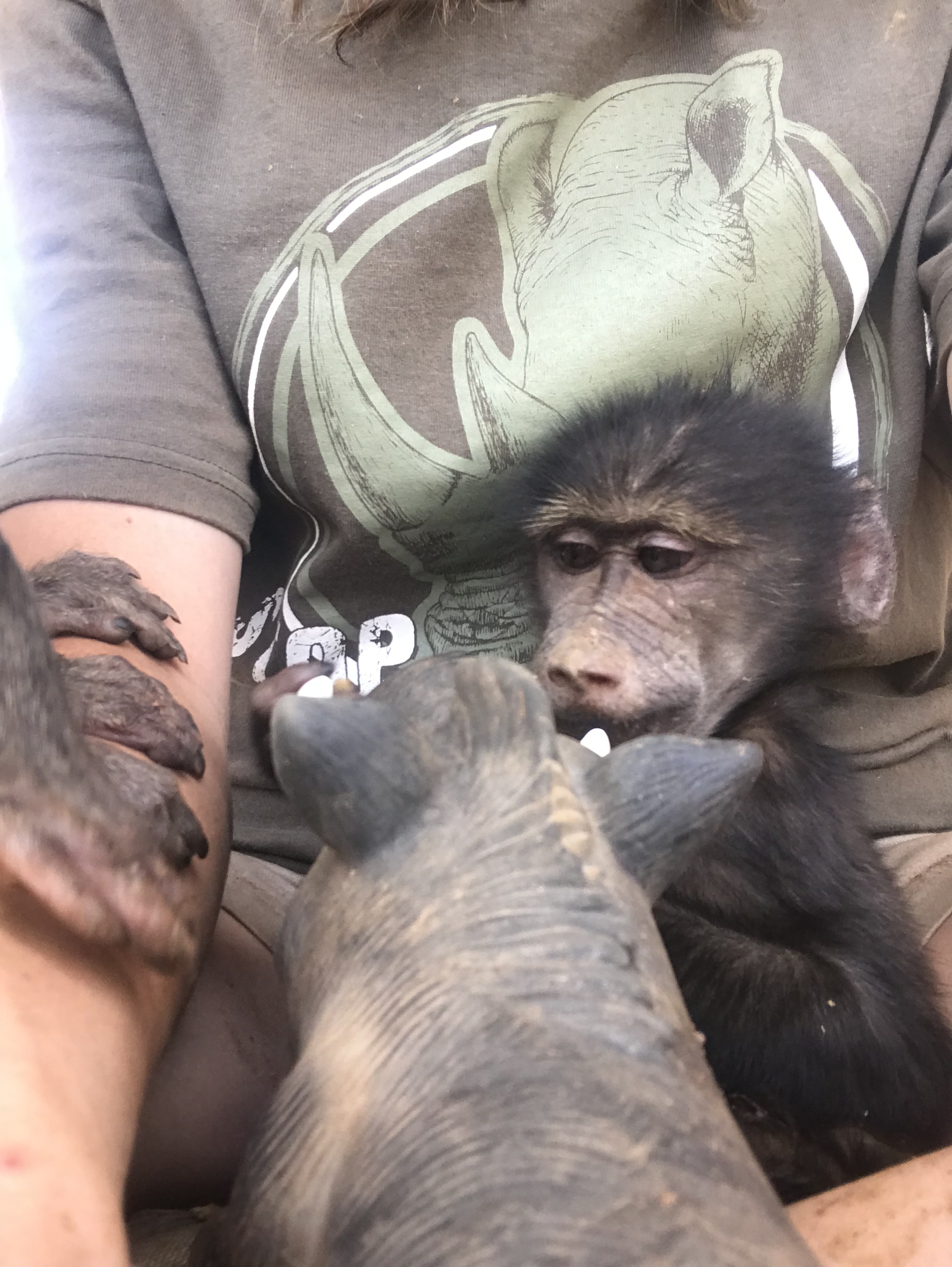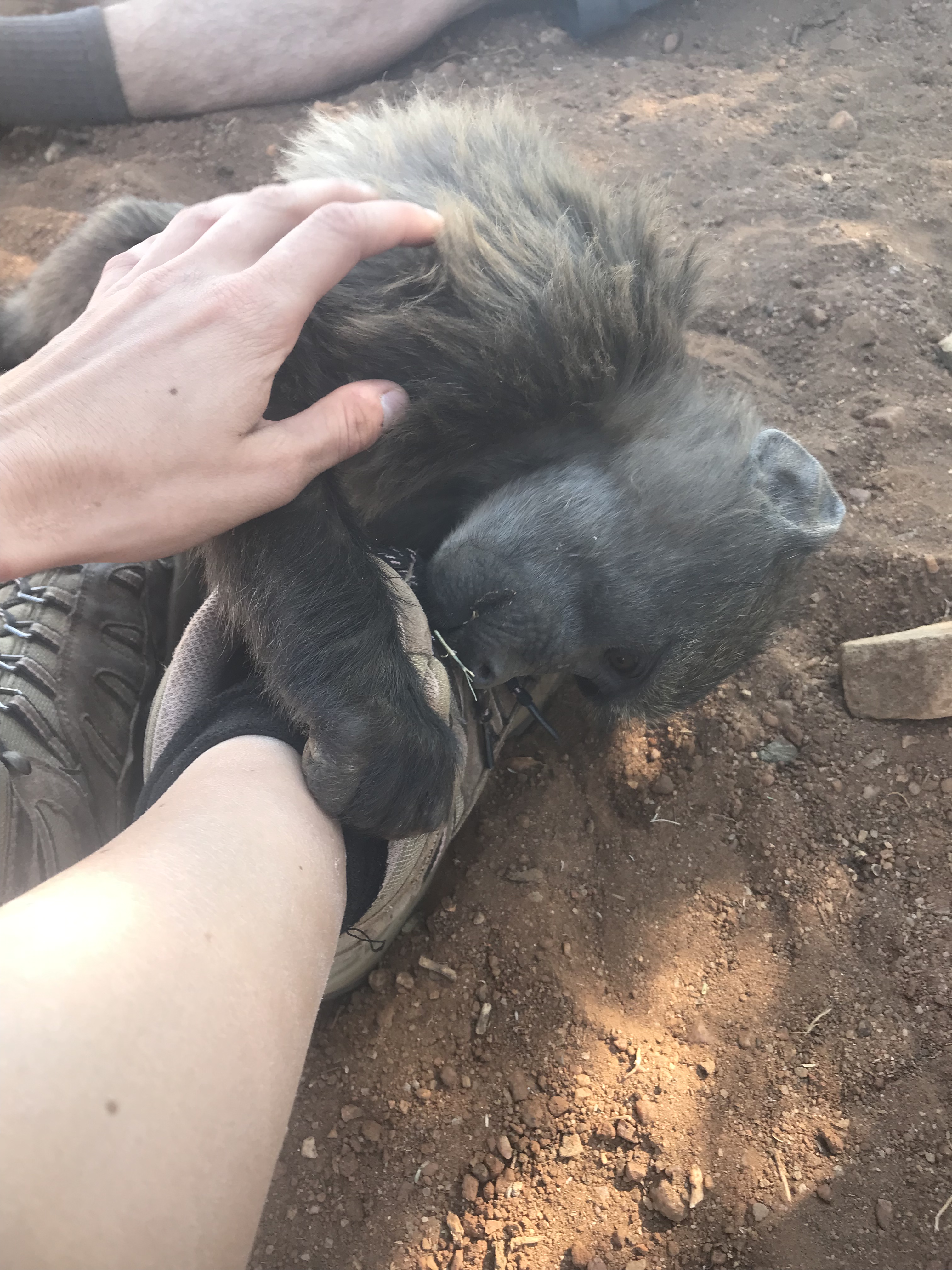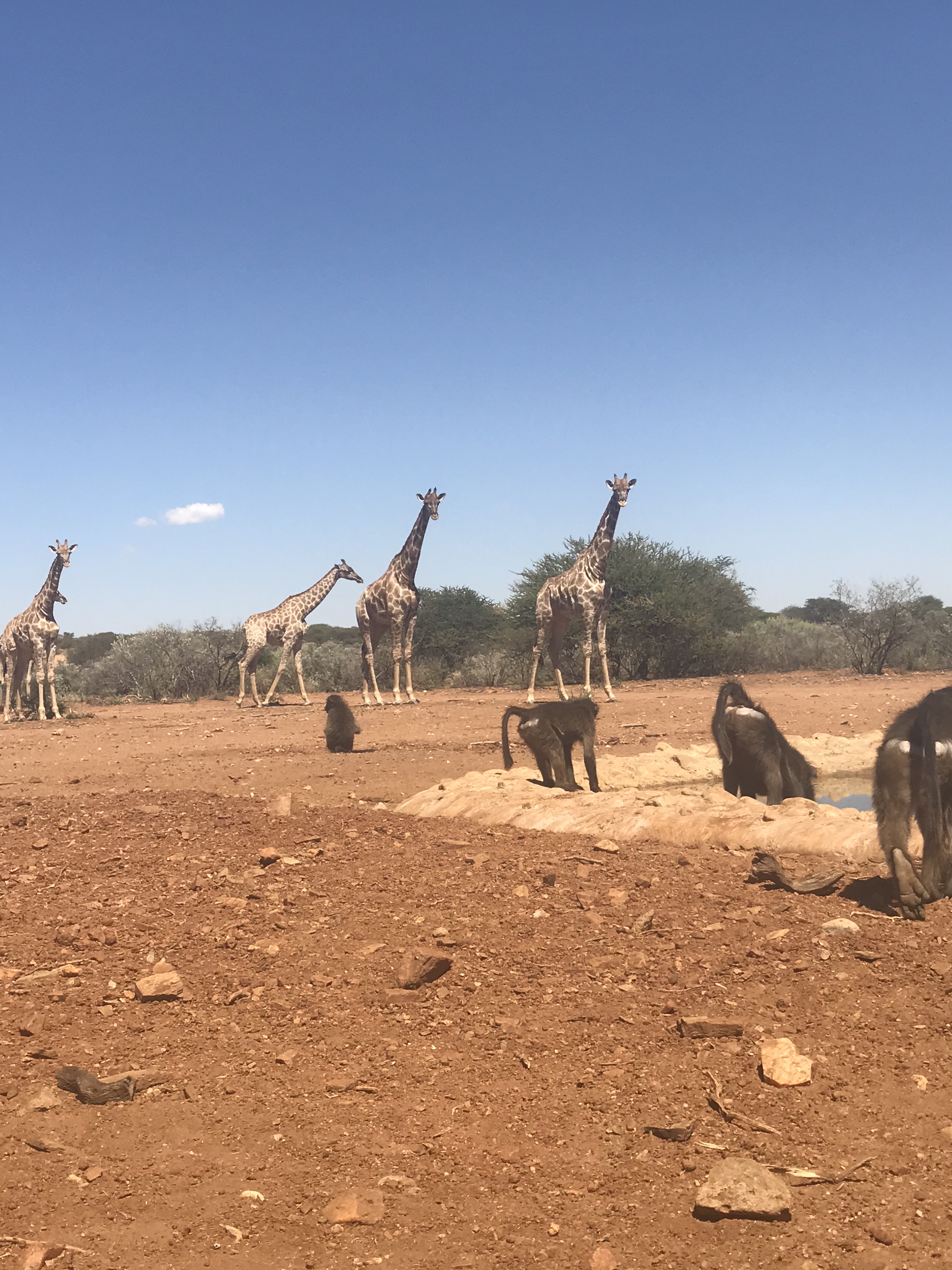 Today, we had another baboon walk but this time we took out the older group. They are still not fully grown so they don’t have their huge canines yet. They were much less interested in us than the younger ones but they still love a good cuddle. While we were there, a herd of about 7 giraffes came up to try to get a drink of water. They got so close to us, about 50 feet away. It was an incredible experience. Unfortunately, they were too afraid of us to actually get a drink but it was still amazing to be that close. We also had a family of warthogs come by but they were also too afraid to get a drink.