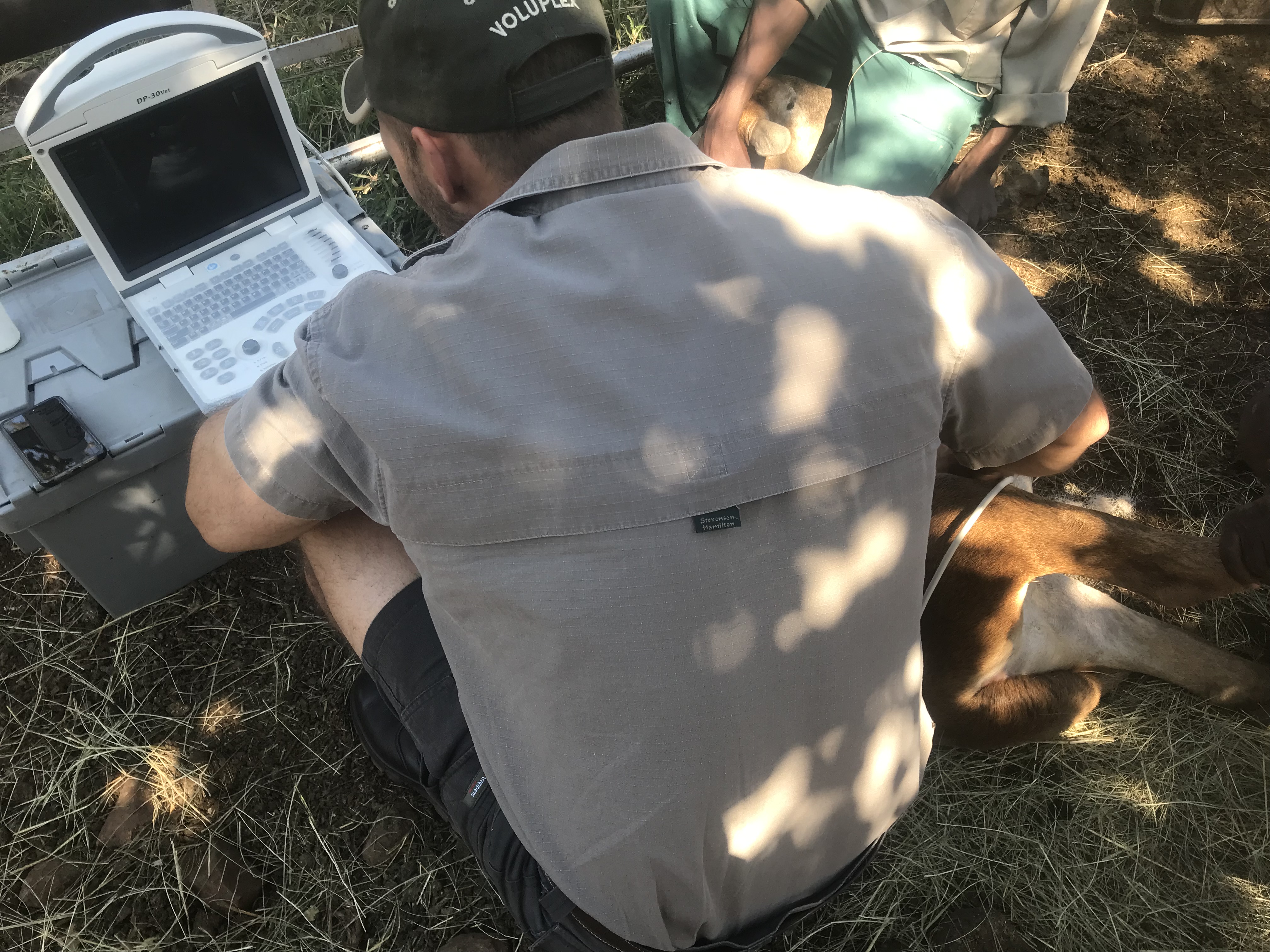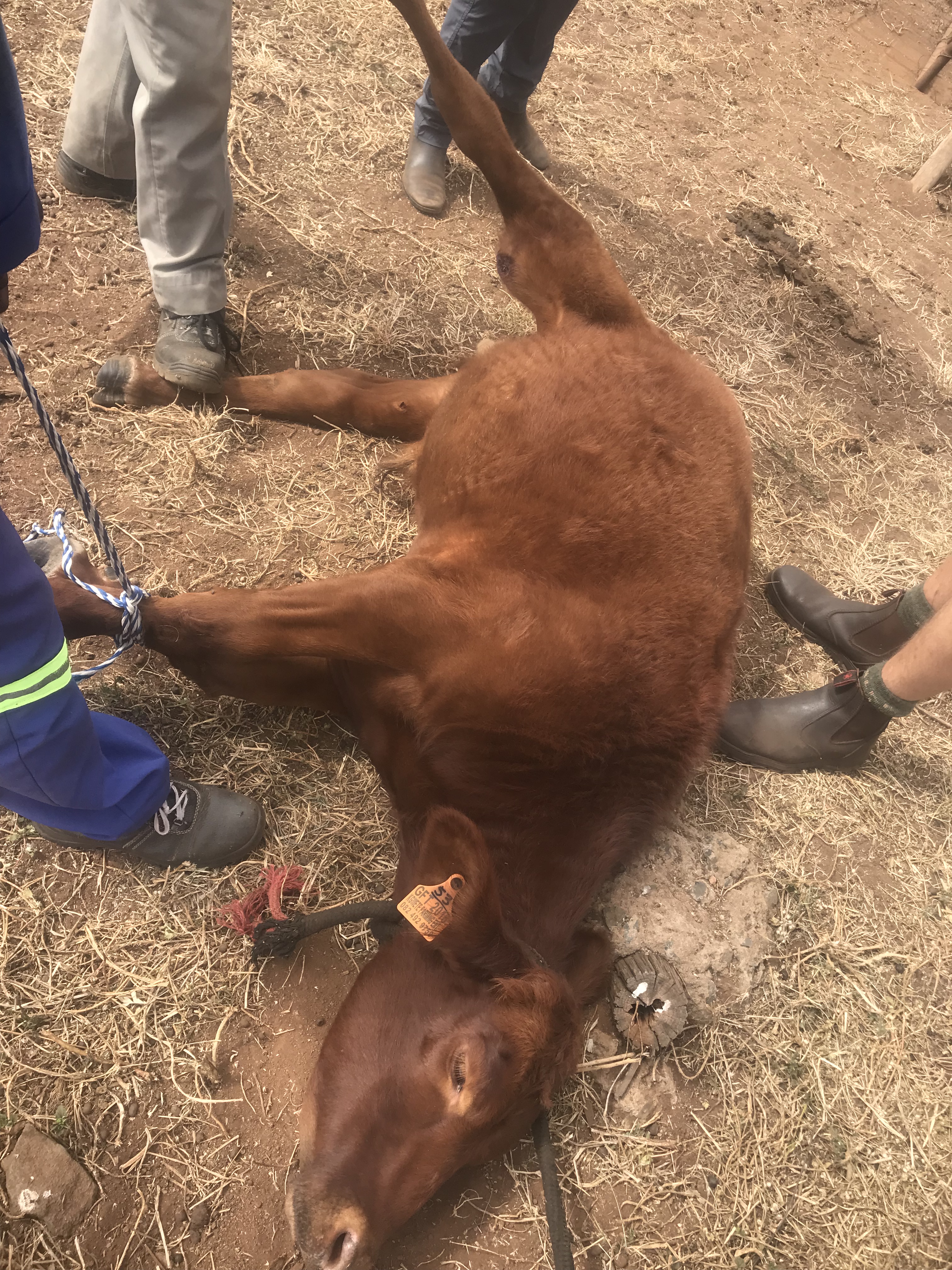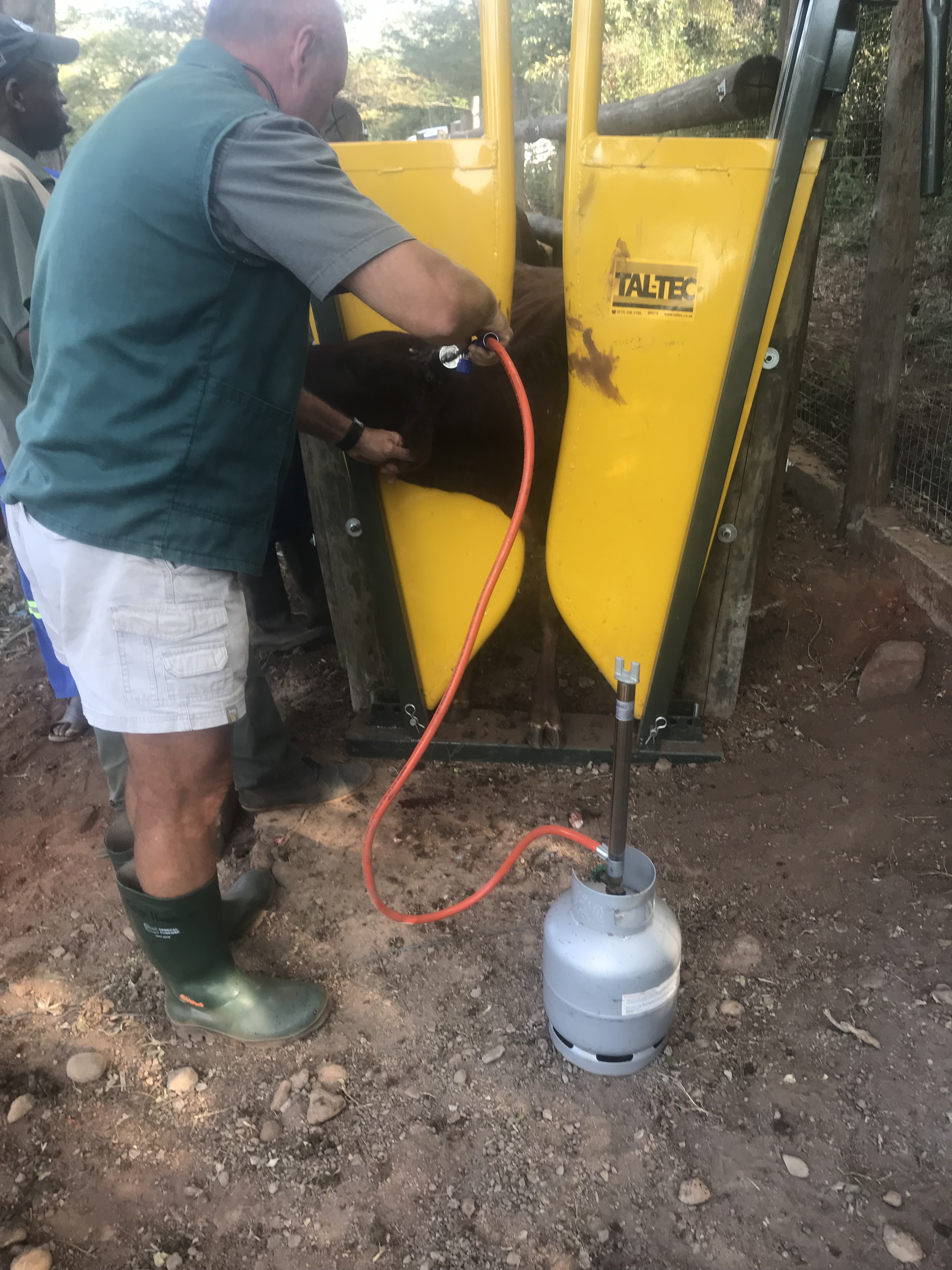 Thursday morning we went with Barend to test out his new ultrasound machine. Our first stop was his farm close to town where he keeps some sheep. He ultra sounded the 3 ewes and all three were pregnant. Then, we went to a piece of property where he keeps some of his cattle and palpated them to determine if they were pregnant. From feeling, he thought that 2 of them were very, very early in their pregnancies. After lunch, we went with Freddy to dehorn some cattle. I had never seen this before because a lot of our cows have been bred not to have horns. Basically, they cut off whatever portion of the horn is there and then cauterize the horn bud so it won’t grow back. It has to be done when the calves are quite young because a sinus forms inside the horn that can become infected if exposed through dehorning.