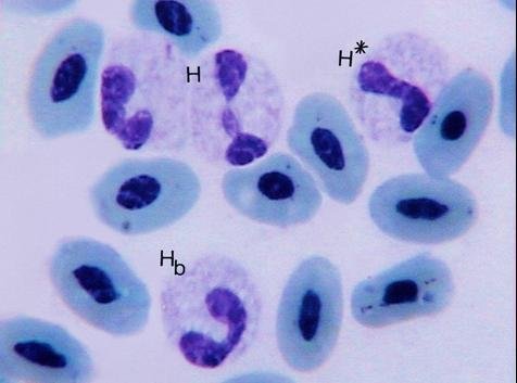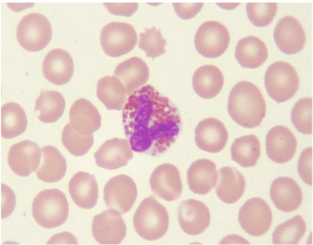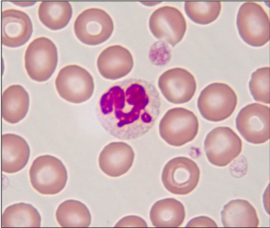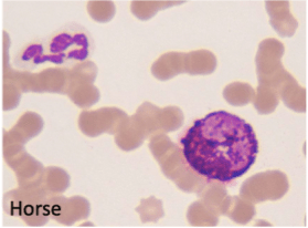 - Neutrophils: In mammals, neutrophils are the most abundant white blood cell in the blood. They are often the first cell to respond to inflammation and infection. They are also capable of “eating” foreign material like bacteria. Neutrophils are identified by their distinct segmented, purple nucleus. In some species, the body holds a large storage pool of neutrophils that it can dispense when needed. The presence of immature neutrophils in the blood indicates that the body’s immune system is overwhelmed by the insult and it cannot produce neutrophils fast enough to fight it. Immature neutrophils look slightly different from their mature counterparts. Instead of the distinct segmented nucleus, the nucleus has a more consistent thickness and sometimes resembles a horseshoe.