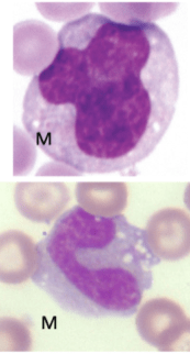- Monocytes/Macrophages: Monocytes/macrophages are the largest of the white blood cells. They are called monocytes when they are still in the blood and macrophages when they enter the tissue. They are primarily responsible for “eating” foreign materials. When they “eat”, they present the foreign object to T cells so that they can determine how to respond. They are commonly seen in chronic, persistent infections when the body has depleted neutrophil stores. Their large size makes them easy to identify because they can have an extremely variable nucleus.